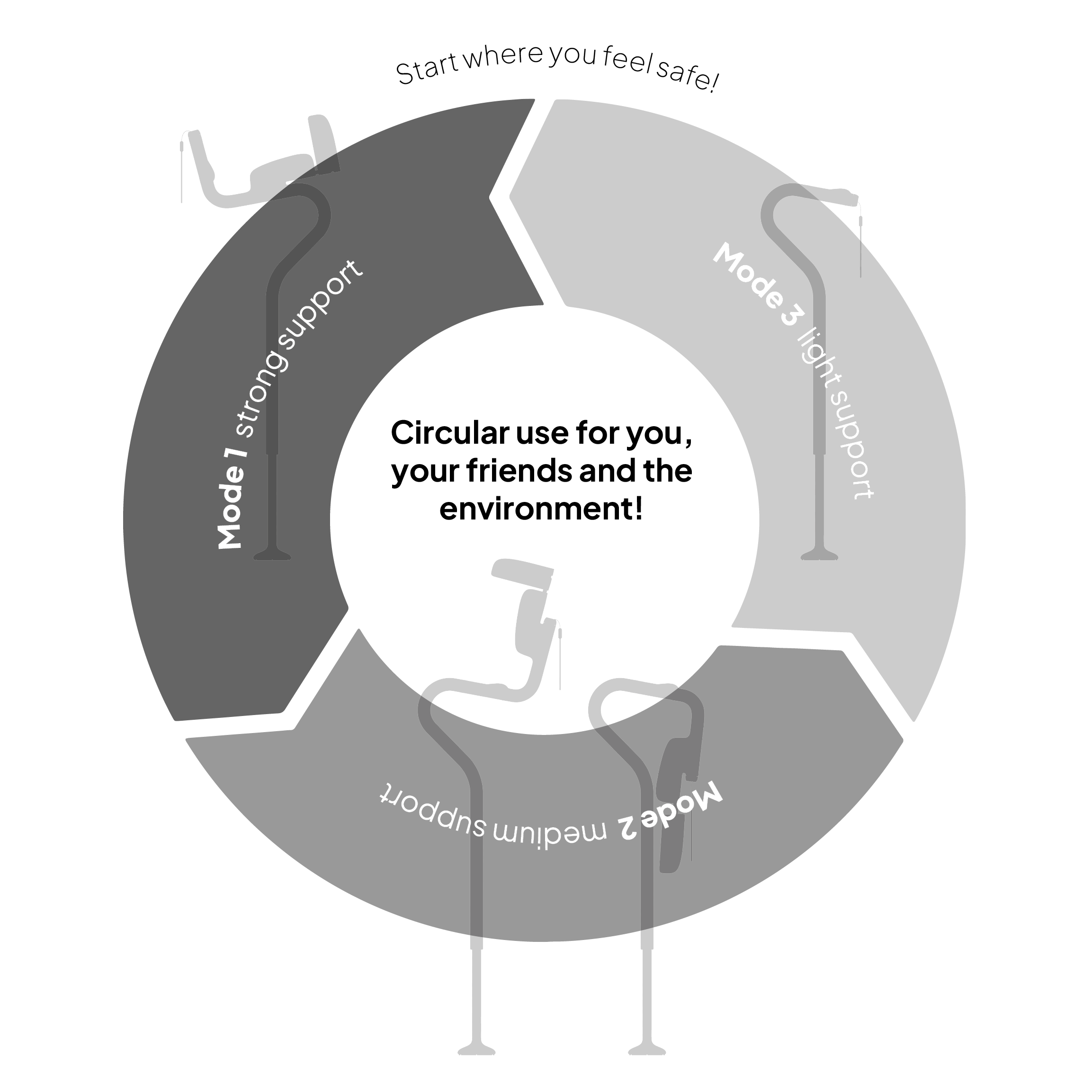 Pedestrian is a walking aid aimed at people with a medium-term walking disability and anyone who needs assistance. It fills the product gap between short-term solutions such as forearm crutches, which are designed for six weeks of use, and long-term assistance systems, such as wheelchairs. The focus of the product is the minimization of consequential damages, which often occur in connection with conventional walking aids and thus result in further disorders of the musculoskeletal system, as well as a pleasant and practical handling, which enables the affected persons to actively participate in social life even with their walking disability. The assistance system can be transformed with only a few hand movements and thus allows an adaptation of the walking aid to the affected persons and their respective assistance needs.